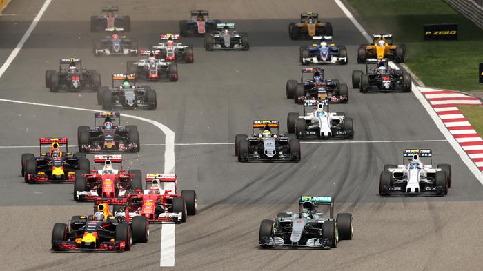 Red Bull driver Daniel Ricciardo of Australia and Mercedes driver Nico Rosberg of Germany lead the field into turn one at the start of the Chinese Formula One Grand Prix at the Shanghai International Circuit, China, Sunday, April 17, 2016. (ANSA/AP Photo/Mark Schiefelbein)