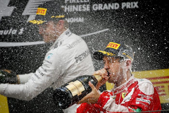 epa05263198 Second placed German Formula One driver Sebastian Vettel (R) of Scuderia Ferrari is splashed with champagne by third placed Russian Formula One driver Daniil Kvyat (not in picture) of Red Bull Racing next to winner German Formula One driver Nico Rosberg (L) of Mercedes AMG GP at the end of the Chinese Formula One Grand Prix at the Shanghai International circuit in Shanghai, China, 17 April 2016. EPA/DIEGO AZUBEL